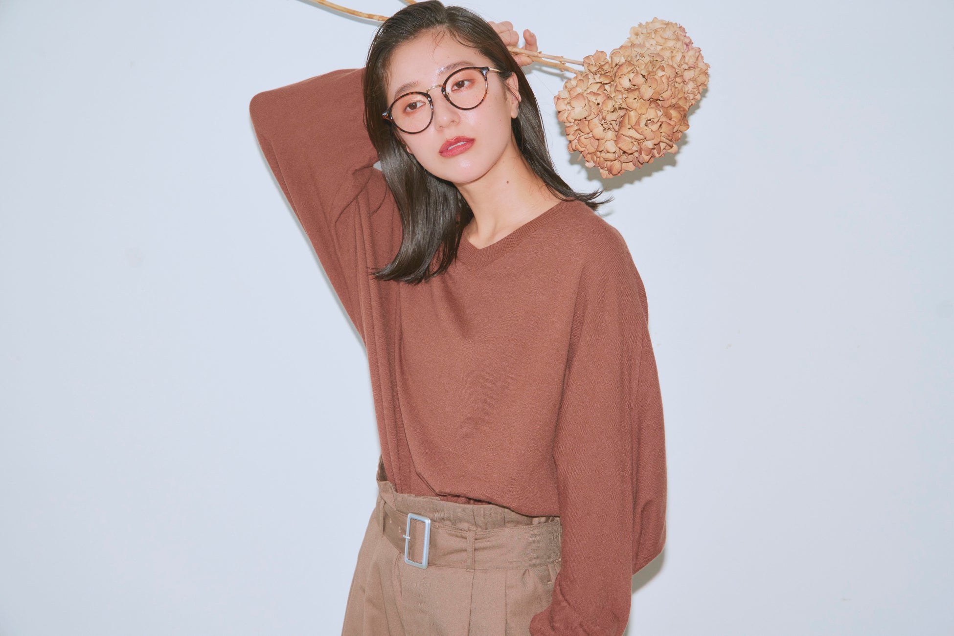 付属のウエストベルトがポイントになったストレートワイドパンツは、ハイウエストデザインと長めの着丈、落ち感のある生地で着用時に綺麗なシルエットに見えるようにしました。