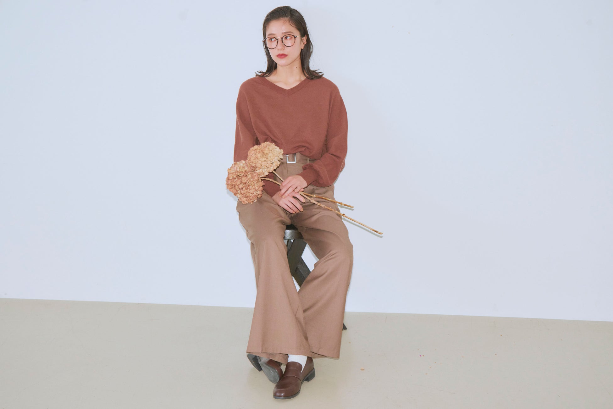 Kint tops:13tm0c4 ¥3,960/Wide pants:13bm057 ¥4,980/Loafers:15am0cd ¥4,980