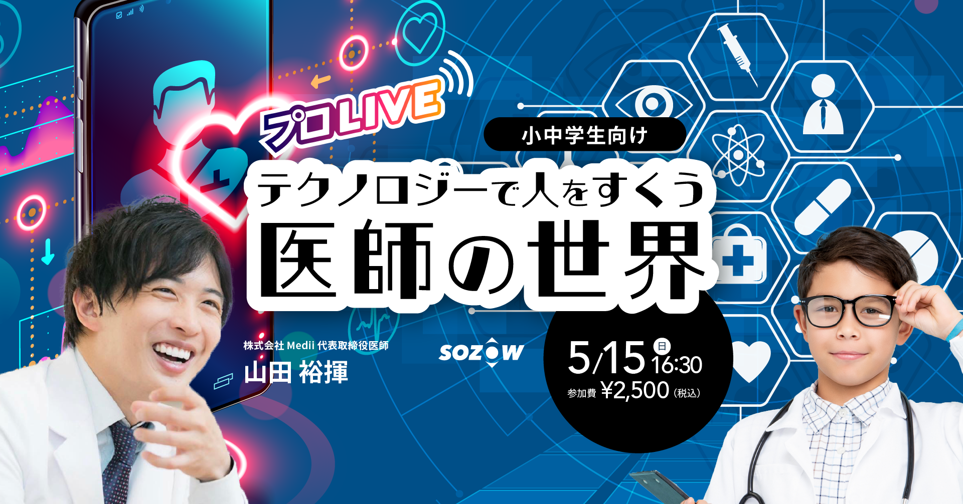 Go Visions株式会社(所在地:東京都品川区、代表取締役:小助川 将)が運営する小・中学生向けオンラインの学び場「SOZOW(ソーゾウ)」は、5月15日(日)に、株式会社Medii 代表取締役医師の山田 裕揮氏をゲストにお迎えし、「医師」の世界について子どもたちが直接お話を聞ける特別イベントを開催いたします。