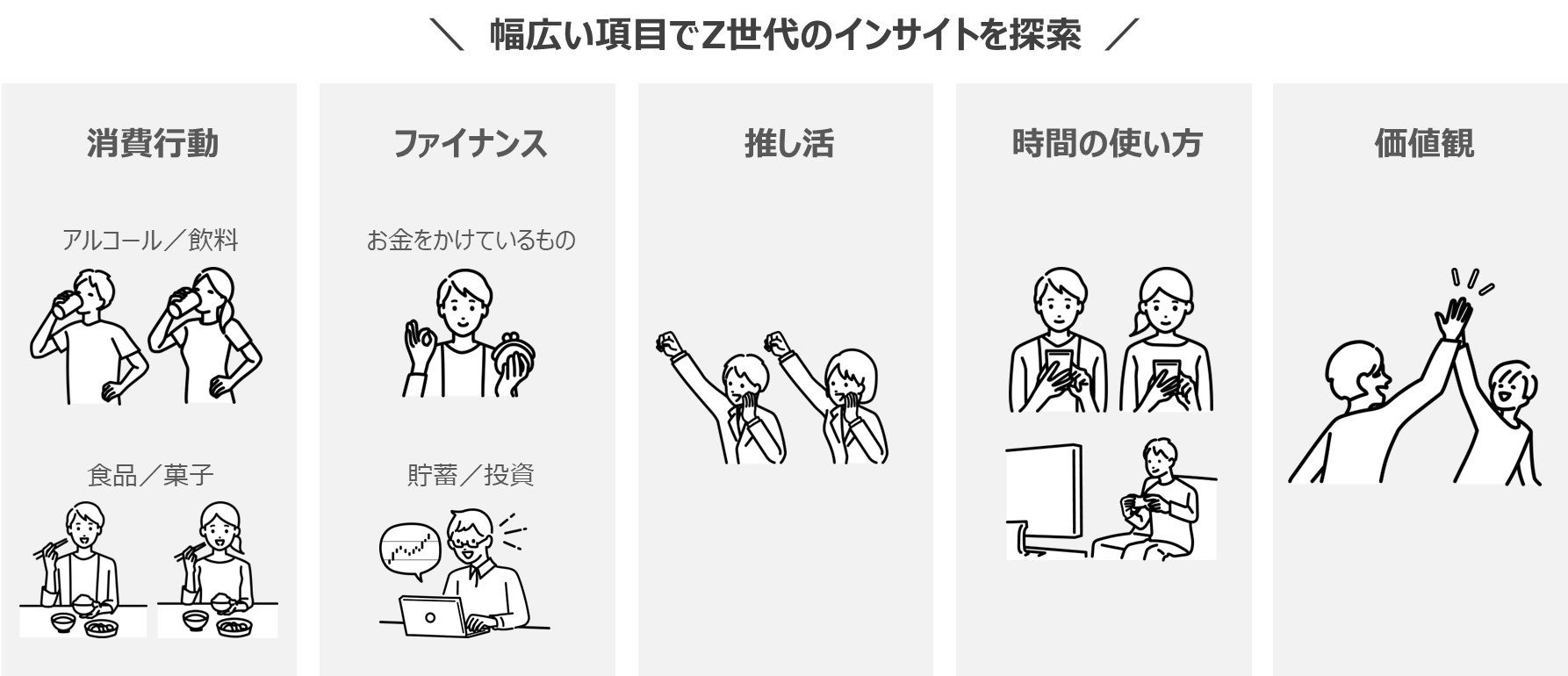 日本インフォメーションでは、 「Z世代」のインサイトに近づくべく、幅広い項目(※1)について意識や行動に関して聴取するインターネット調査を行いました。※1:食品飲料品の購入実態、時間の使い方、消費行動(お金)、推し活、気持ち・考え方 等