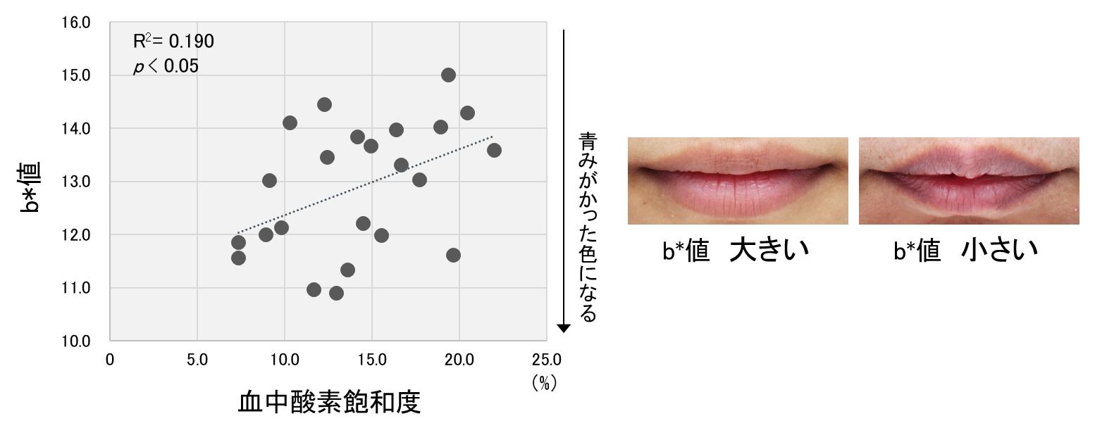 唇の色みと関連のある生体因子を調べた結果、血流量が多いほどa*値が大きく、唇の赤みが強くなることがわかりました(図3)。また、血中酸素飽和度が高いほどb*値が大きくなることもわかりました(図4)。血中酸素飽和度が高いほど血液は鮮やかな赤色を示す一方、血中酸素飽和度が低いほど暗褐色を示します。つまり、血中酸素飽和度が低いほどb*値が小さく、青みがかった色み(青紫色)になると考えられました。