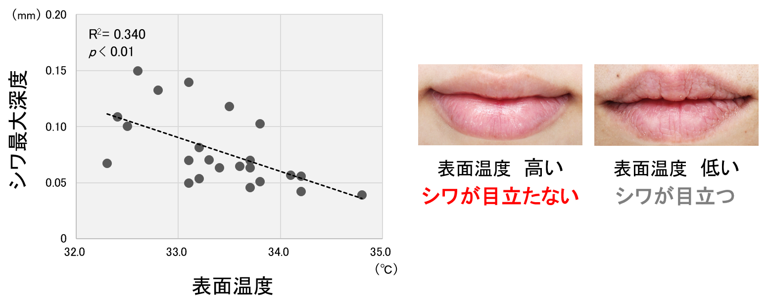 唇のシワと関連のある生体因子について調べた結果、表面温度が高いほど、シワの深さが浅く、目立たないことがわかりました(図6)。唇の表面温度が高いと、細胞の活動が高まり、コラーゲンなどの産生が促され、シワが目立たなくなると考えられました。