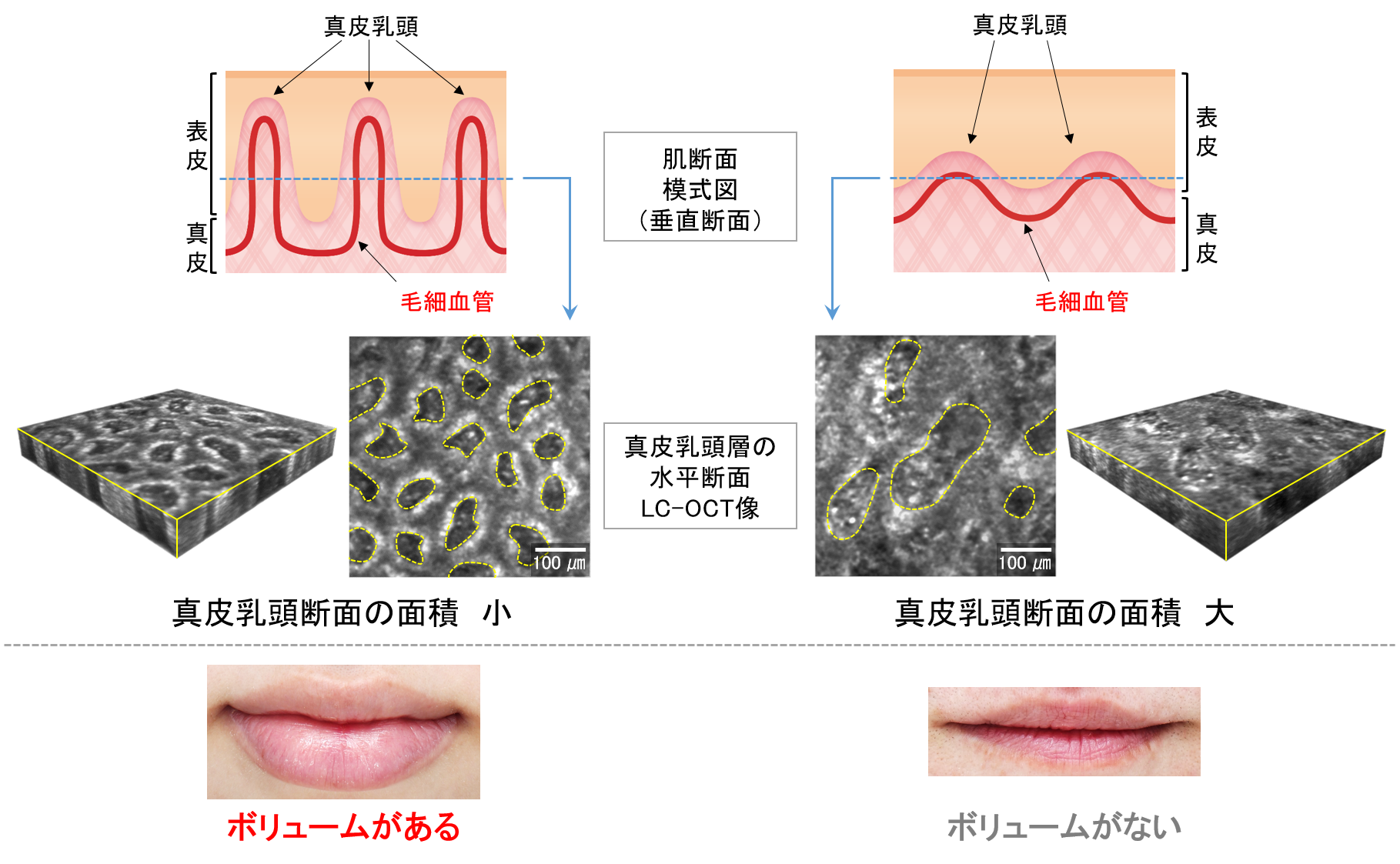 唇のボリュームと関連のある生体因子を調査するため、肌を傷つけずに内部構造を観察できるLC-OCT※2顕微鏡を用いて観察を行いました。その結果、表皮と真皮の境にある凹凸構造(真皮乳頭)の水平断面面積が小さいほど唇のボリュームがあることがわかりました(図5)。真皮乳頭には、酸素や栄養を運ぶ毛細血管が入り込んでいることが知られています。真皮乳頭断面の面積が小さい場合、血管がヘアピン状になって真皮乳頭の上部まで伸びていると考えられ、酸素と栄養が広く行き渡ることでヒアルロン酸などの基質が産生されやすくなり、ボリュームが増すと推測されました。
