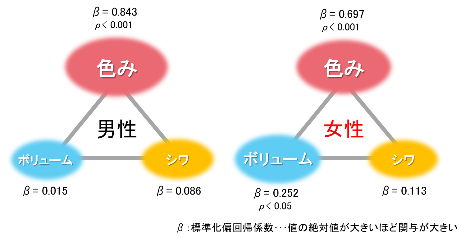 その結果、男性評価者においては、「色み」の関与が最も大きくなりました。一方、女性評価者においては、「色み」の関与が最も大きかったものの、「ボリューム」も関与することがわかりました。すなわち、「色み」、「ボリューム」、「シワ」のうち、男性は「色み」を、女性は「色み」と「ボリューム」を重視していることが明らかになりました(図1)。