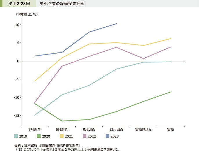 中小企業庁ウェブサイト「2024年版 中小企業白書」によると、非製造業における設備の過不足感について、中小企業では2021年第4四半期、大企業では2022年第3四半期よりDI(※)がマイナスに転じており、2023年では、中小企業・大企業共に不足感が強まっている傾向にあります。また、中小企業の2023年度における設備投資計画は、高い水準となっており、設備投資の機運も高まっていることが示唆されています。このような概況の中、サブスクというビジネスモデルを最大活用し、企業の設備投資をサポートすることで、顧客の事業成長に貢献します。