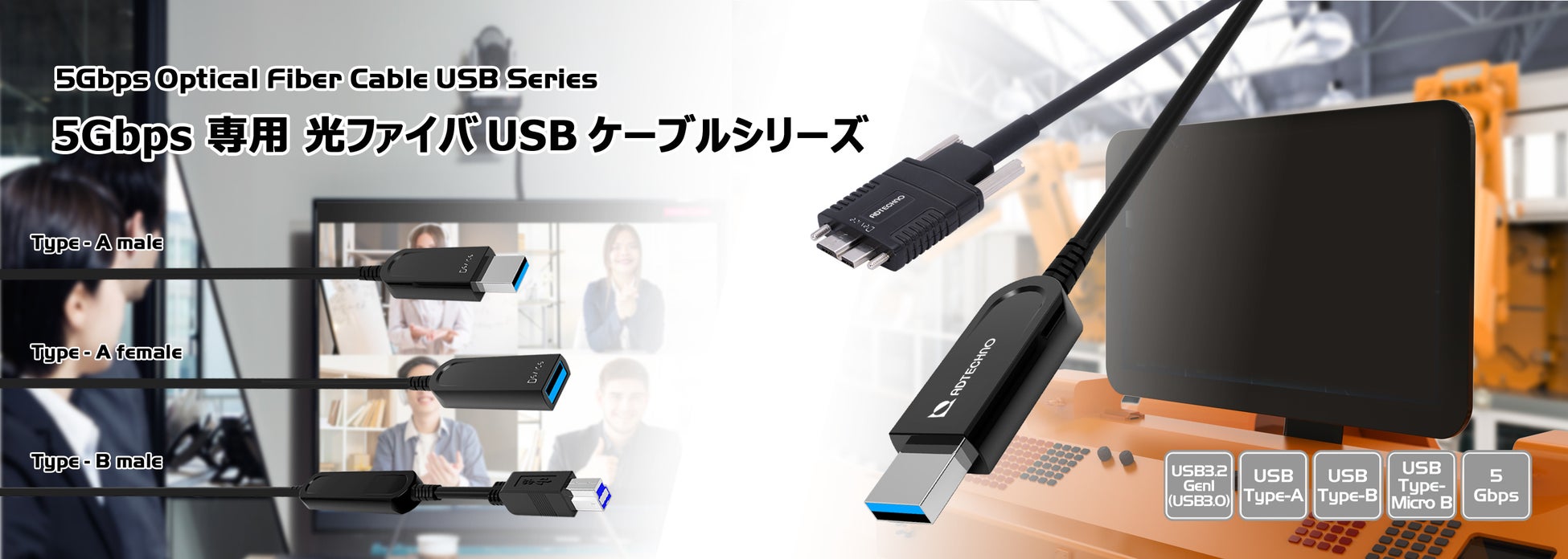 5Gbps対応 光ファイバUSBケーブルシリーズは会議室用WEBカメラや産業用マシンビジョンカメラ、医療機器、サーバールーム、FA機器との接続など、USBの長距離転送やノイズフリーが求められるシステムに最適な製品です。
