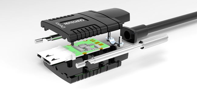 光ファイバと銅線のハイブリット構造ケーブルを採用。ケーブル外径4.5mmの超細径仕様となっており、従来の銅線ケーブルと比べて取り回しが容易かつ軽量です。ケーブル被覆には柔軟で伸びが良いTPUを標準採用し、許容曲げ半径20mmに耐えられる柔軟性を実現しました。※4) また特注にて、LSZH仕様(低煙ゼロハロゲン)や、CMP仕様(難燃性グレード)の被覆への変更が可能です。※5)