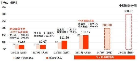 当社は中期経営計画として25/3期に売上高300億円、経常利益率10%を掲げていますが、24/3期は中計2年目となります。