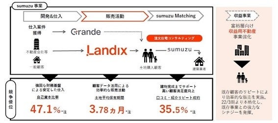 注文住宅用の土地の仕入に特に強みがあり、デザイン・建築ノウハウも含めて建築事業者とのマッチングビジネスも併せて速い営業効率と在庫回転(これが市況変動へのリスクヘッジでもある)が強みです。