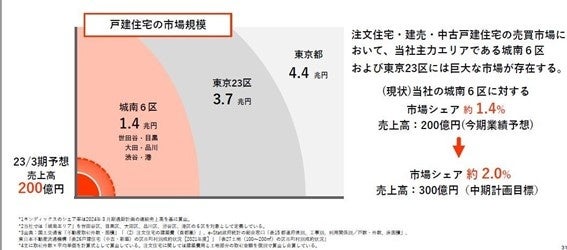 現状、城南6区だけでも土地、新築、中古の戸建売買を併せると1.4兆円ほどの市場規模があると推計していますが、このうち2%程度を獲得することで中期目標の300億円に到達します。