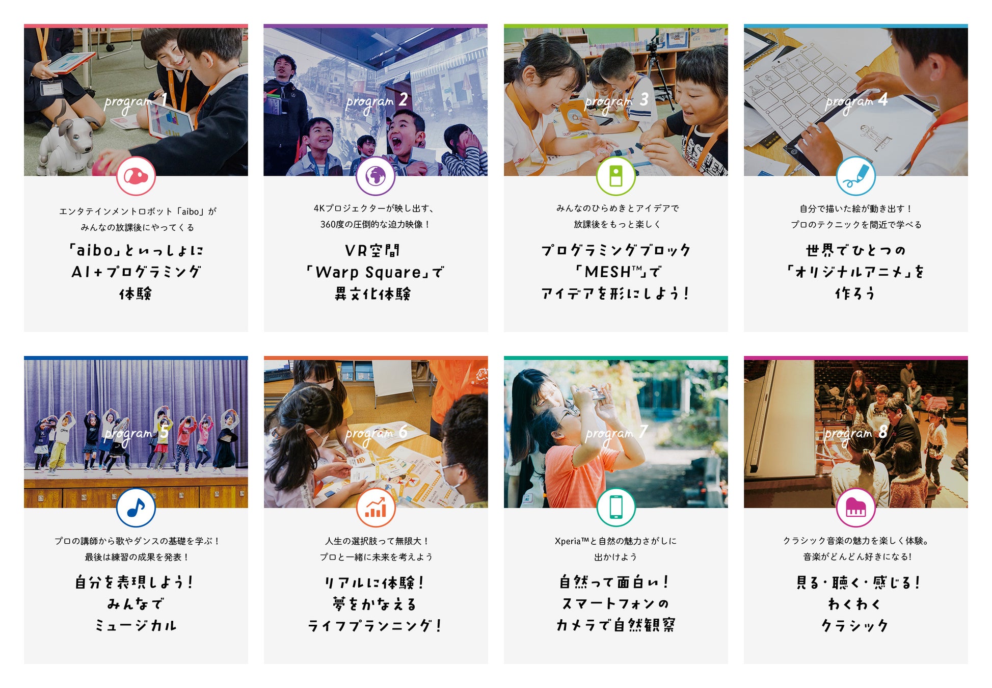 感動体験プログラムでは、子どもの教育格差縮小に向けて、ソニーのテクノロジーやエンタテインメントを活用した多様なプログラムを、小学生の放課後を対象として活動を行っている全国20団体に提供します。