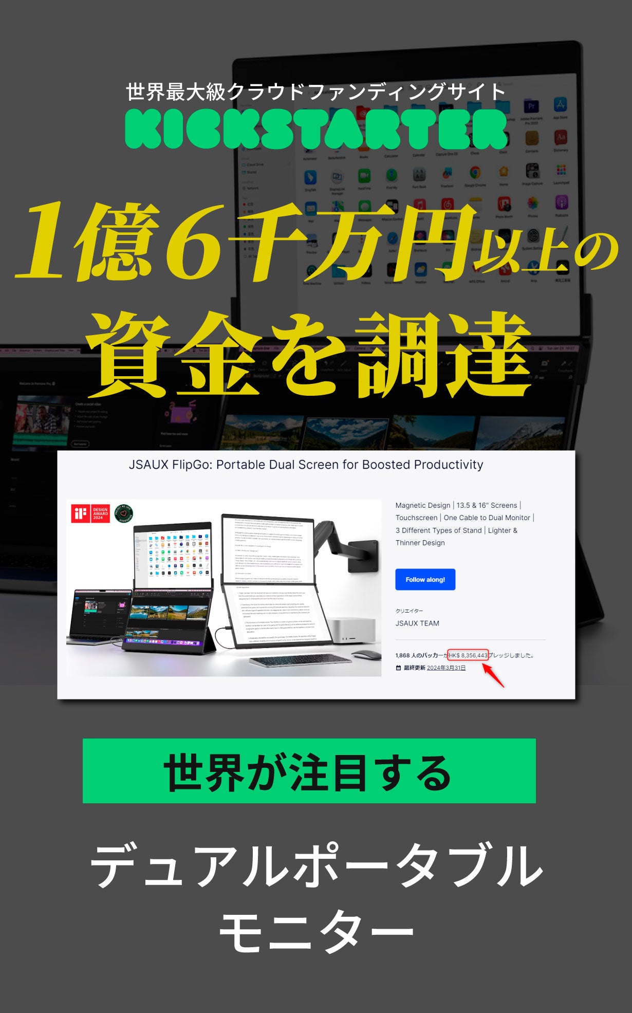 Kickstarterで1.6億円以上の資金を調達した話題のデュアルポータブルモニター!