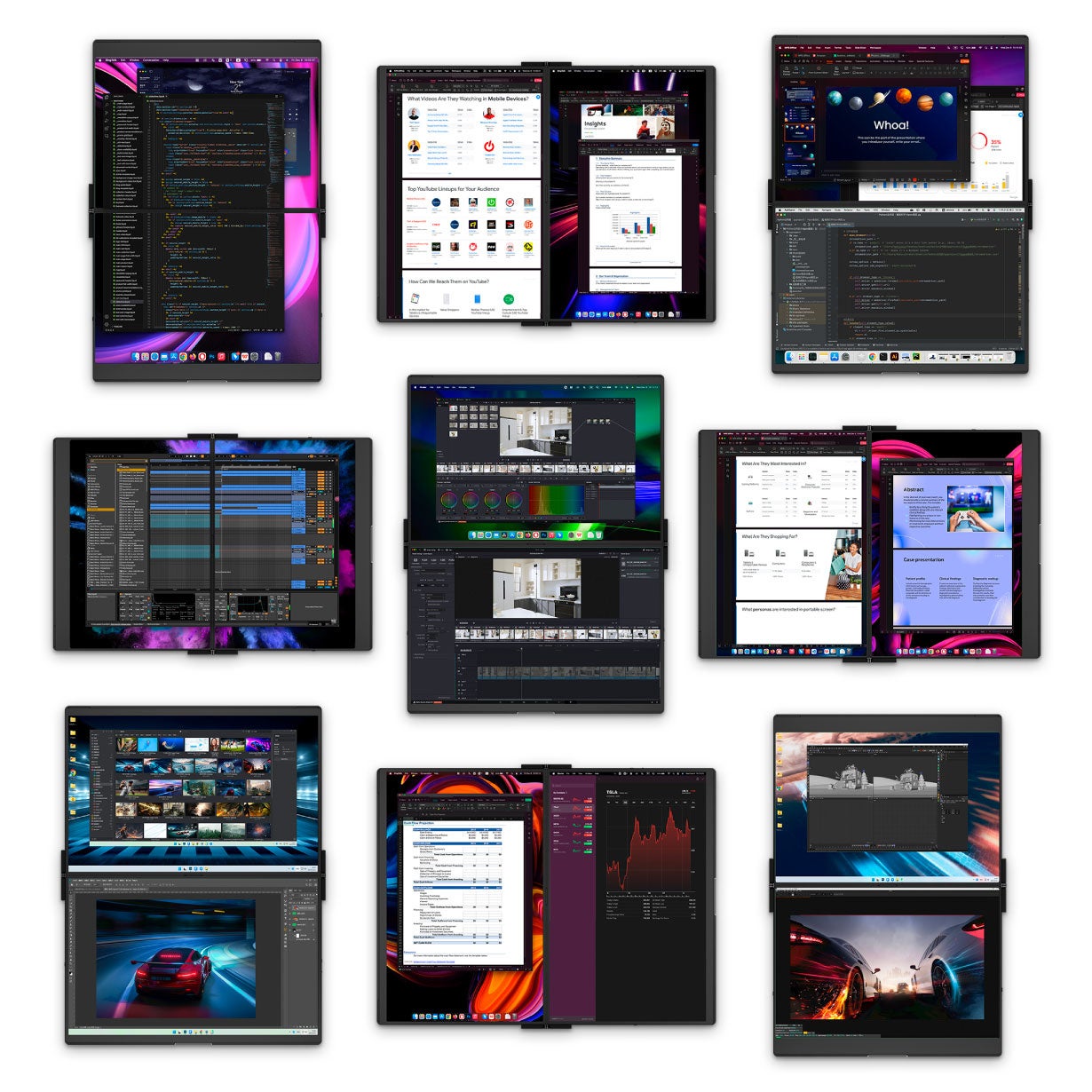 二画面折りたたみ式デザインの為、2つの画面を折りたたみ式に組み合わせることができ、出張やカフェでのリモートワーク、休憩時間のエンターテインメントなど、様々なシーンで活躍します。