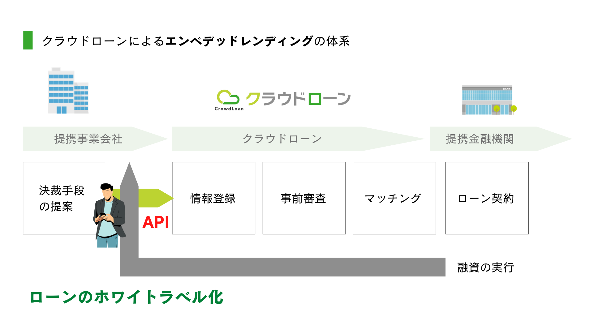 クラウドローンは、貸し手である銀行と借り手である個人を、オンラインでつなぐマッチングプラットフォームです。提携の保証会社において事前審査を行うことで、自身にピッタリの銀行ローン選びができる国内初のサービスです。直接借り手である個人への認知拡大を図ると同時に、車販売事業者、不動産賃貸仲介業や学校・教育関連事業者などを対象として埋込型金融(Embedded Finance)を推進しております。事業者の顧客が商品購入の申込をする際に、決済手段の提案としてホワイトラベル化した弊社の仕組みを活用いただくことで、集客のコストダウンや回収リスクを払しょくできたなどのお声をいただいております。