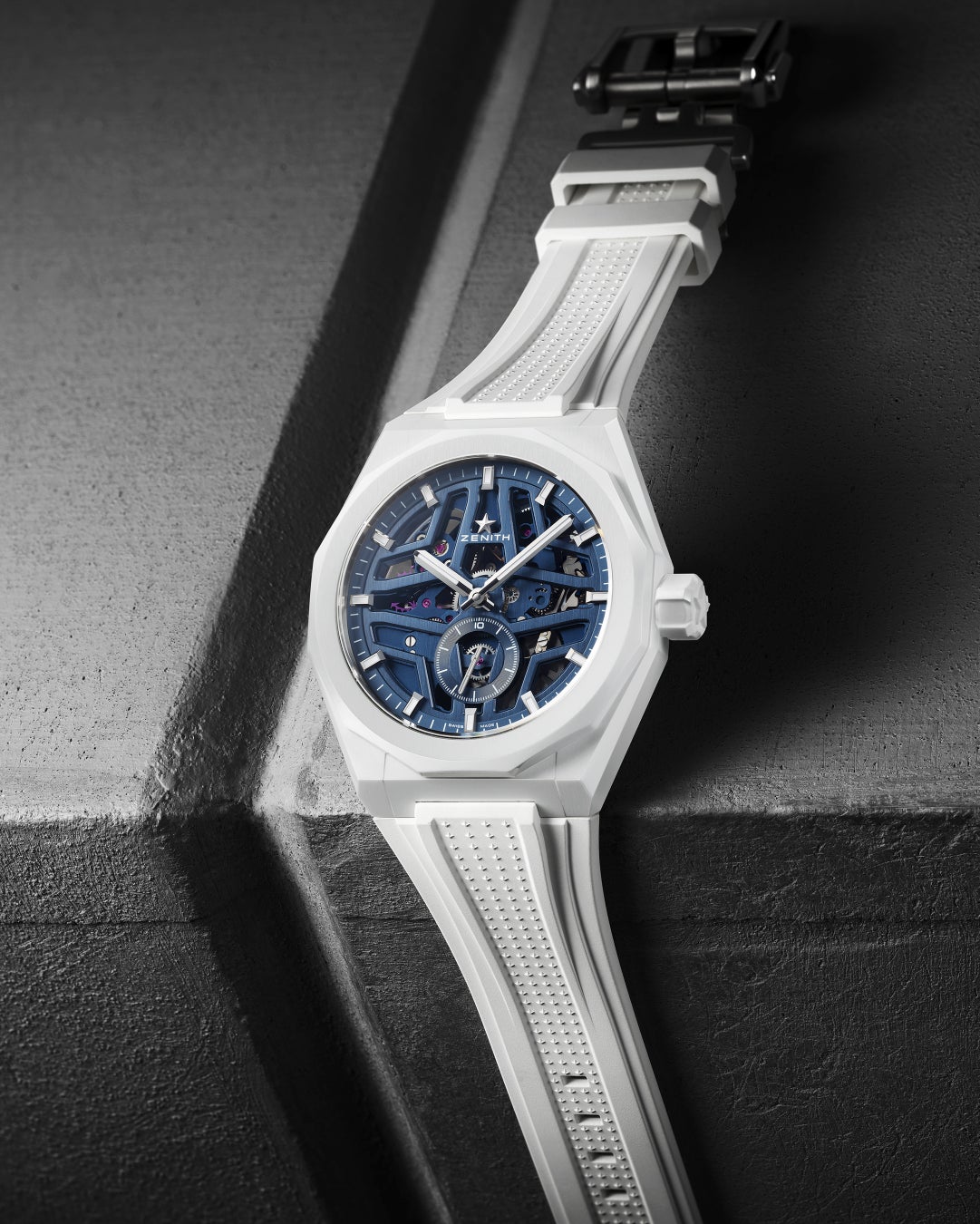 深みのあるブルーで彩られたスケルトンムーブメントとオープンワーク文字盤は、ホワイトセラミックの外観を一層引き立てます。光の角度によってニュアンスの異なるブルーを見せるオープンワーク文字盤は、ゼニスを象徴する4つの点を結んだ星を表現しています。このモチーフは1969年以来のゼニスの象徴であり、「デファイ」コレクションに繰り返し用いられています。その下に見えるオープン構造のエル・プリメロ 3620SK ムーブメントも、夜空を思わせるゼニスのシグネチャーブルーに仕上げられました。従来の秒針付き文字盤とは異なり、「デファイ スカイライン」は世界初にして唯一の、10秒で1回転しながら常に動き続ける1/10秒表示を備え、夏の一瞬一瞬がかけがえのないものであることを思い出させてくれる相棒となります。