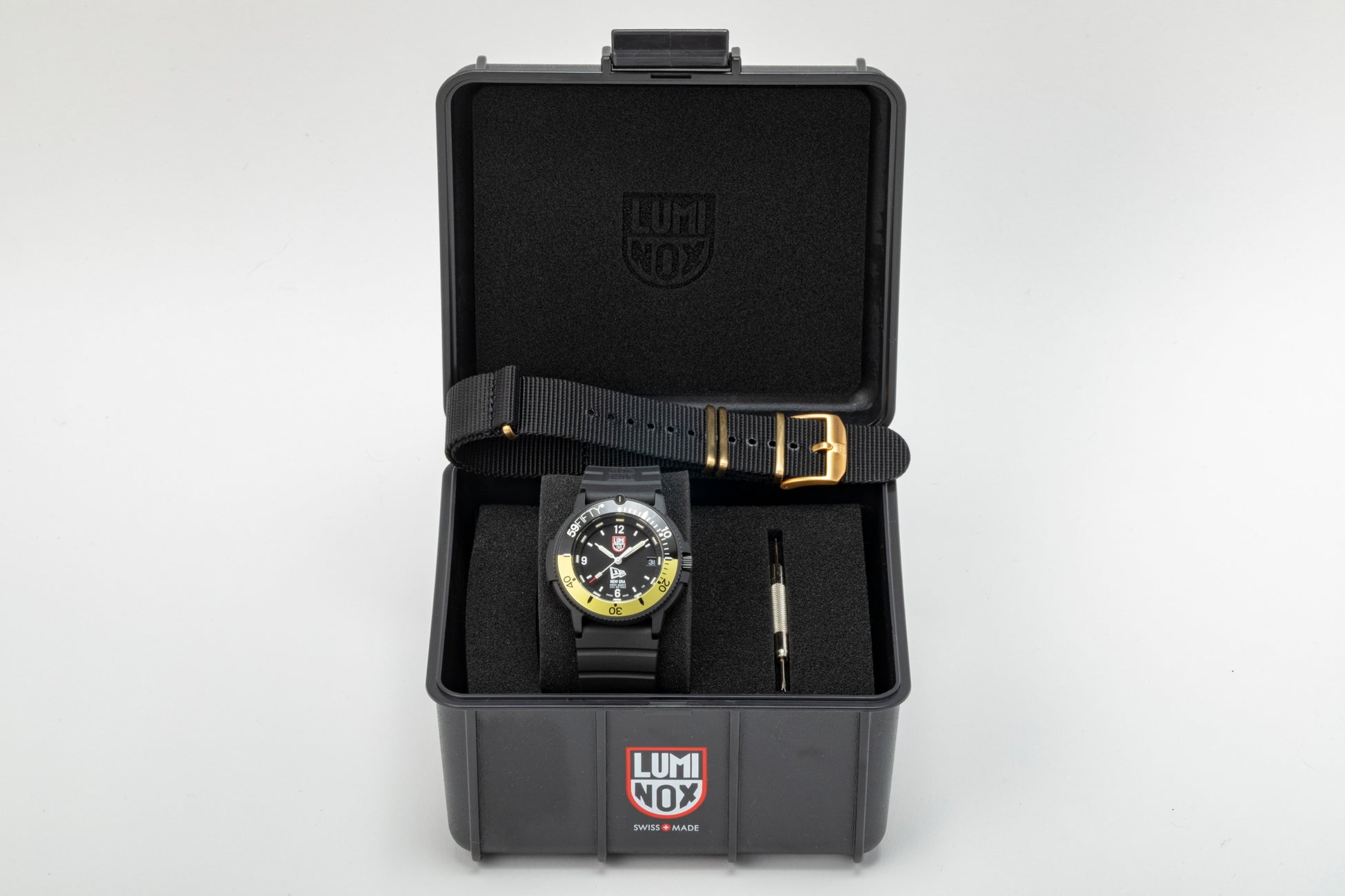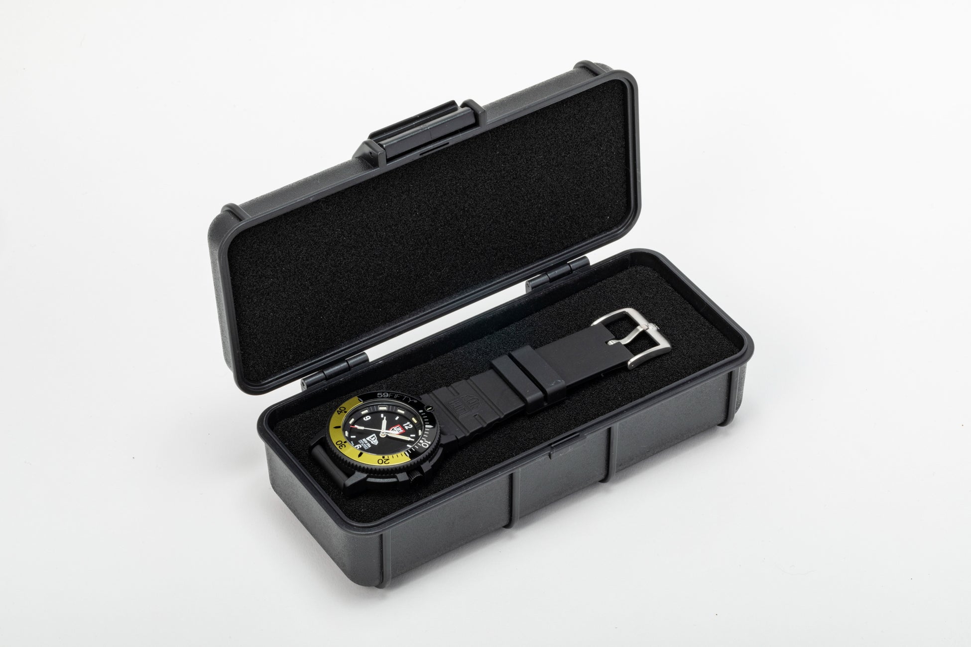 コントラストの効いたベゼル、ブランドロゴをあしらった文字盤、裏蓋には今回のコラボレーションを表した両社のロゴをエッジングしカスタマイズ。ケースには軽量且つ耐久性に優れたCARBONOX™を使用、防水・耐圧性能を高めた2重のリューズ構造を採用することで20atm/200Mとなっています。