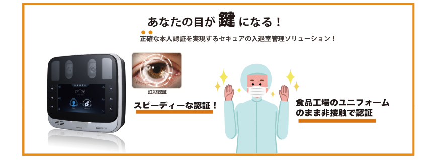 当社は、食品工場等の「フードディフェンス対策」となるセキュリティソリューションをご紹介します。日清オイリオ株式会社様やエヌフーズ株式会社様など、多くの食品工場で導入いただいている顔認証システムや、食品工場のユニフォームのまま「正確な本人認証」が可能となる最新の虹彩認証、広い工場内のスタッフの動きを把握できる360°(全方位)フィッシュアイカメラ等を実際に体験していただけます。