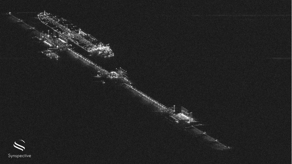 i. 海上にあるオイルターミナルです。この石油ターミナルは、全長770メートルの4つのバースを持つ1つのシーバースで構成されています。等間隔に並ぶ灯柱が確認できます。