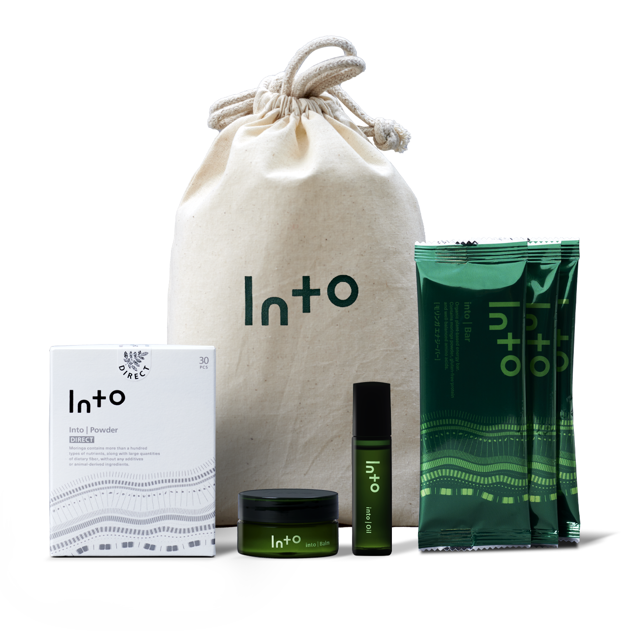 Intoは、奇跡の植物と呼ばれる「モリンガ」を使用した総合ケアブランドです。 原材料の生産は植物由来のものにこだわり、加工段階でも豊富な栄養分や効用を可能な限りとどめる手法を採用しています。