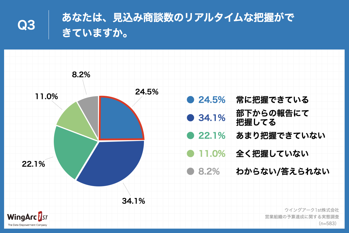 「Q3.あなたは、見込み商談数のリアルタイムな把握ができていますか。」(n=583)と質問したところ、「常に把握できている」が24.5%、「部下からの報告にて把握している」が34.1%という回答となりました。