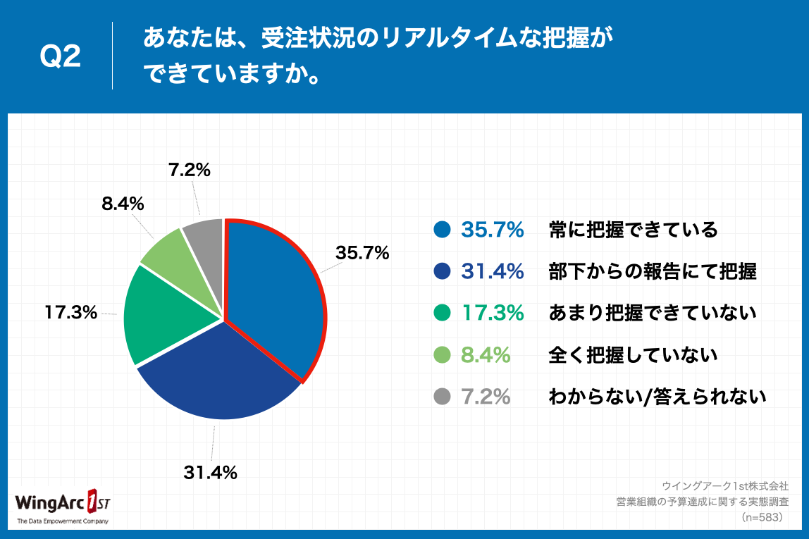 「Q2.あなたは、受注状況のリアルタイムな把握ができていますか。」(n=583)と質問したところ、「日次で把握している」が35.7%、「週次で把握している」が31.4%という回答となりました。