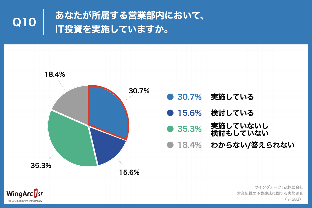 「Q10.あなたが所属する営業部内において、IT投資を実施していますか。」(n=583)と質問したところ、「実施している」が30.7%、「検討している」が15.6%という回答となりました。