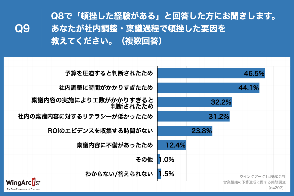 9.社内調整・稟議過程の頓挫要因は、「予算を圧迫すると判断されたため」が46.5%で最多