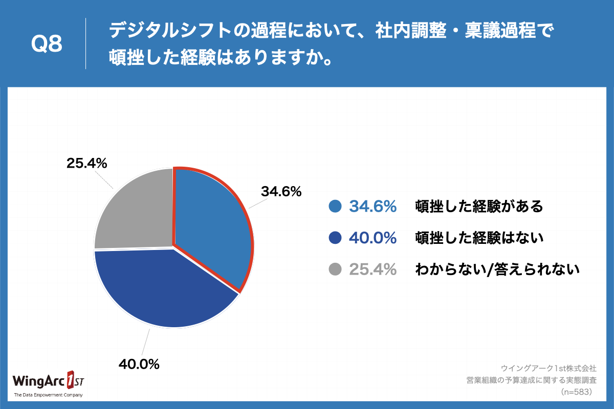 「Q8.デジタルシフトの過程において、社内調整・稟議過程で頓挫した経験はありますか。」(n=583)と質問したところ、「頓挫した経験がある」34.6%、「頓挫した経験はない」が40.0%という回答となりました。