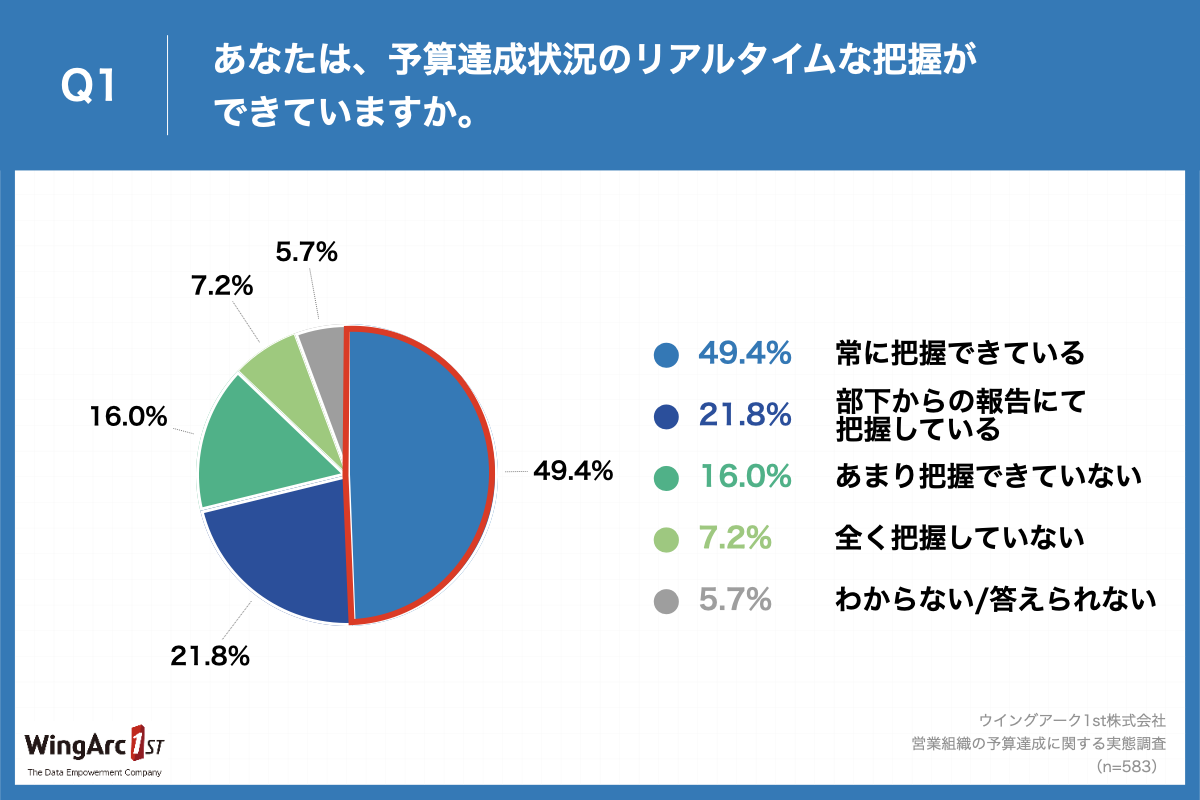 「Q1.あなたは、予算達成状況のリアルタイムな把握ができていますか。」(n=583)と質問したところ、「常に把握できている」が49.4%、「部下からの報告にて把握している」が21.8%という回答となりました