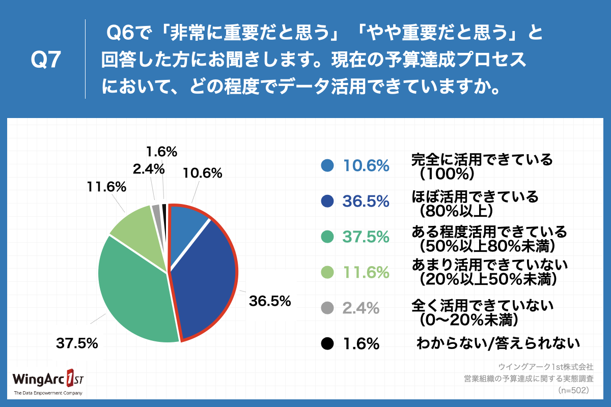 Q6で「非常に重要だと思う」「やや重要だと思う」と回答した方に、「Q7.現在の予算達成プロセスにおいて、どの程度でデータ活用できていますか。」(n=502)と質問したところ、「完全に活用できている(100%)」が10.6%、「ほぼ活用できている(80%以上)」が36.5%という回答となりました。