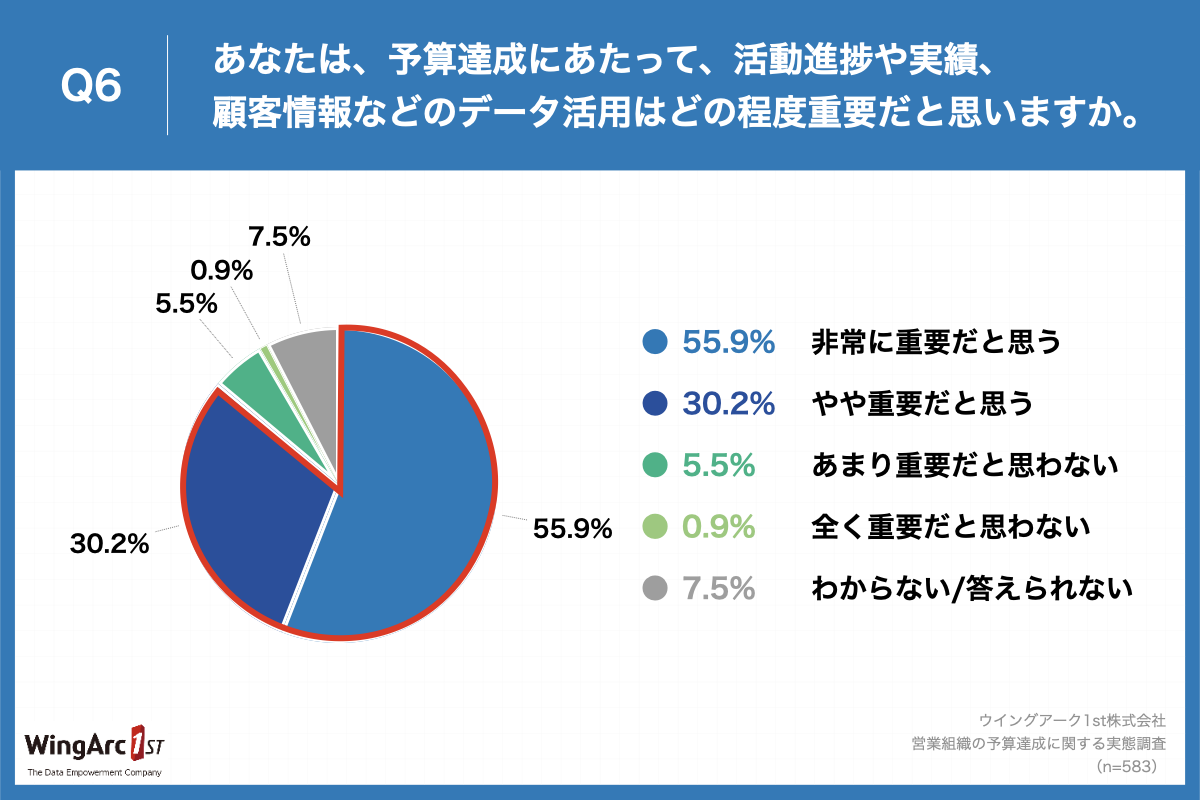 「Q6.あなたは、予算達成にあたって、活動進捗や実績、顧客情報などのデータ活用はどの程度重要だと思いますか。」(n=583)と質問したところ、「非常に重要だと思う」が55.9%、「やや重要だと思う」が30.2%という回答となりました。