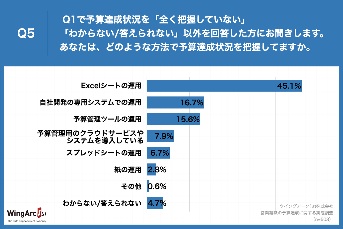 Q1で予算達成状況を「全く把握していない」「わからない/答えられない」以外を回答した方に、「Q5.あなたは、どのような方法で予算達成状況を把握していますか。」(n=503)と質問したところ、「Excelシートの運用」が45.1%、「自社開発の専用システムでの運用」が16.7%、「予算管理ツールの運用」が15.6%という回答となりました。