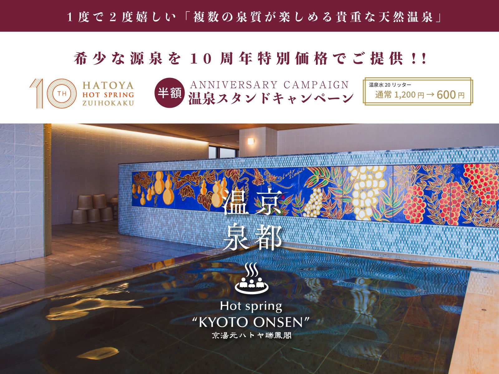 京都温泉10周年記念キャンペーンの概要をご案内いたします。セルフサービス式の温泉スタンドは、京都駅からすぐ近くに位置しており、お手軽にに温泉気分を満喫できます。キャンペーン期間は2024年3月10日(日)から5月8日(水)まで、通常価格1,200円のところ、600円(税込)でご利用いただけます。