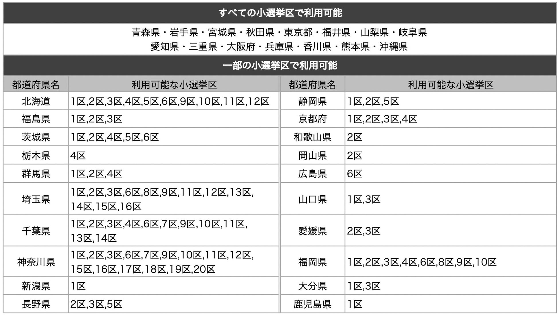 全国35都道府県・200選挙区以上で利用可能に。青森/岩手/宮城/秋田/東京/福井/山梨/岐阜/愛知/三重/大阪/兵庫/香川/熊本/沖縄は全区でその他20道府県でも一部選挙区で利用可能に。エリア拡大へ