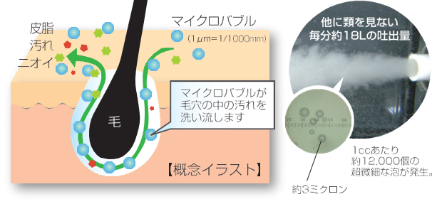 水と空気でできた超微細な気泡が、肌のすみずみまでの汚れや毛穴の奥の老廃物などに付着して浮き上がらせるほか、気になるニオイの元も洗い流します。