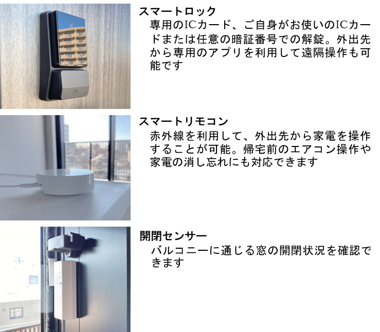 ①スマートロック、②開閉センサー、③スマートリモコンを通して、見守り、帰宅通知、リモート家電操作等々が可能となり、ライフスタイルがよりスマートになります。