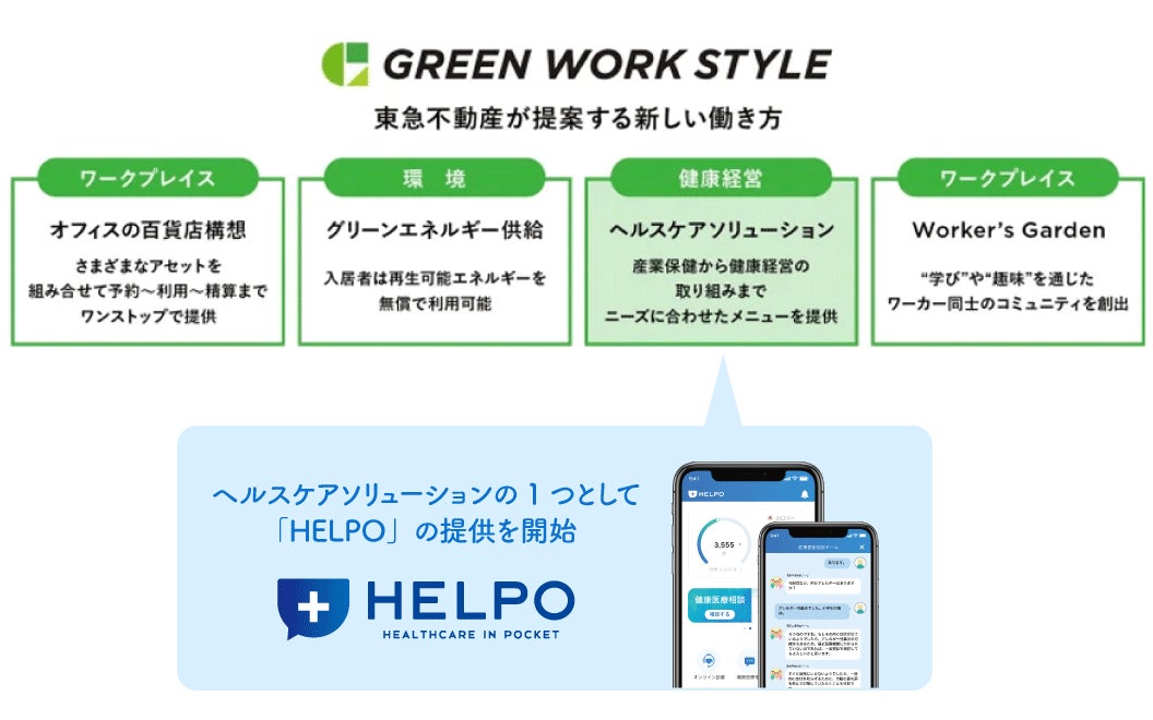 ヘルスケアアプリ「HELPO」が東急不動産の提供するウェルビーイングソリューション「GREEN WORK STYLE」で提供が開始されました