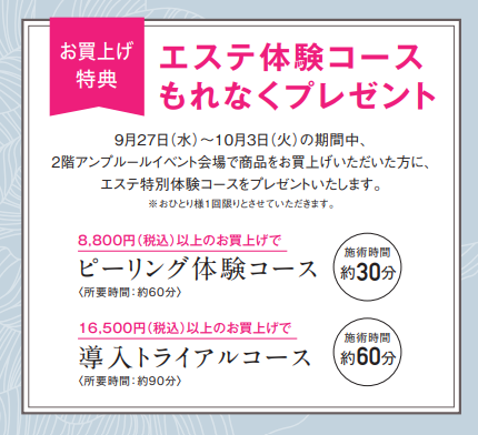このたび、9月27日(水)~10月3日(火)の期間中、 2階アンプルールイベント会場で商品をお買上げいただいた方に、エステ特別体験コースをプレゼントいたします。