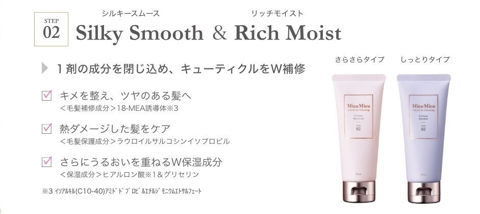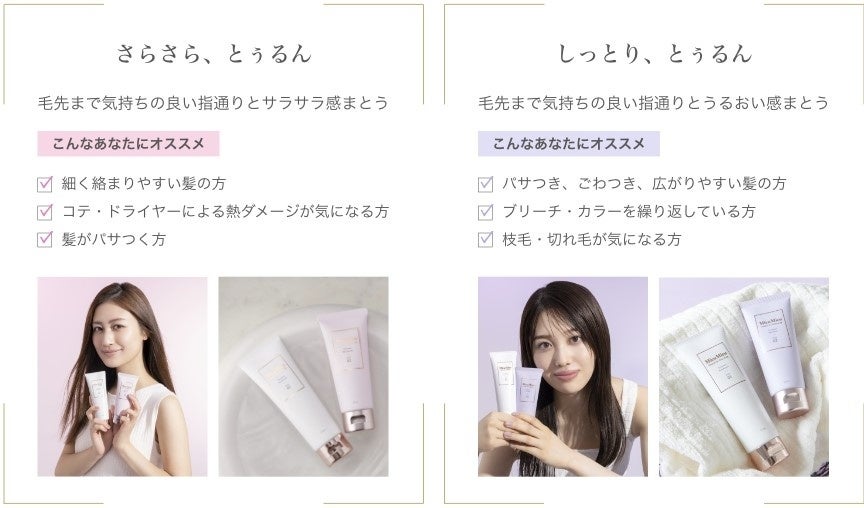 さらに、仕上がりの質感は「さらさらタイプ」と「しっとりタイプ」の2種類あり、髪質や髪のお悩みに合わせて選べます。