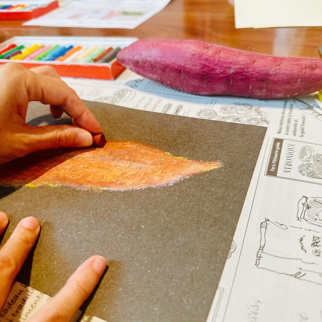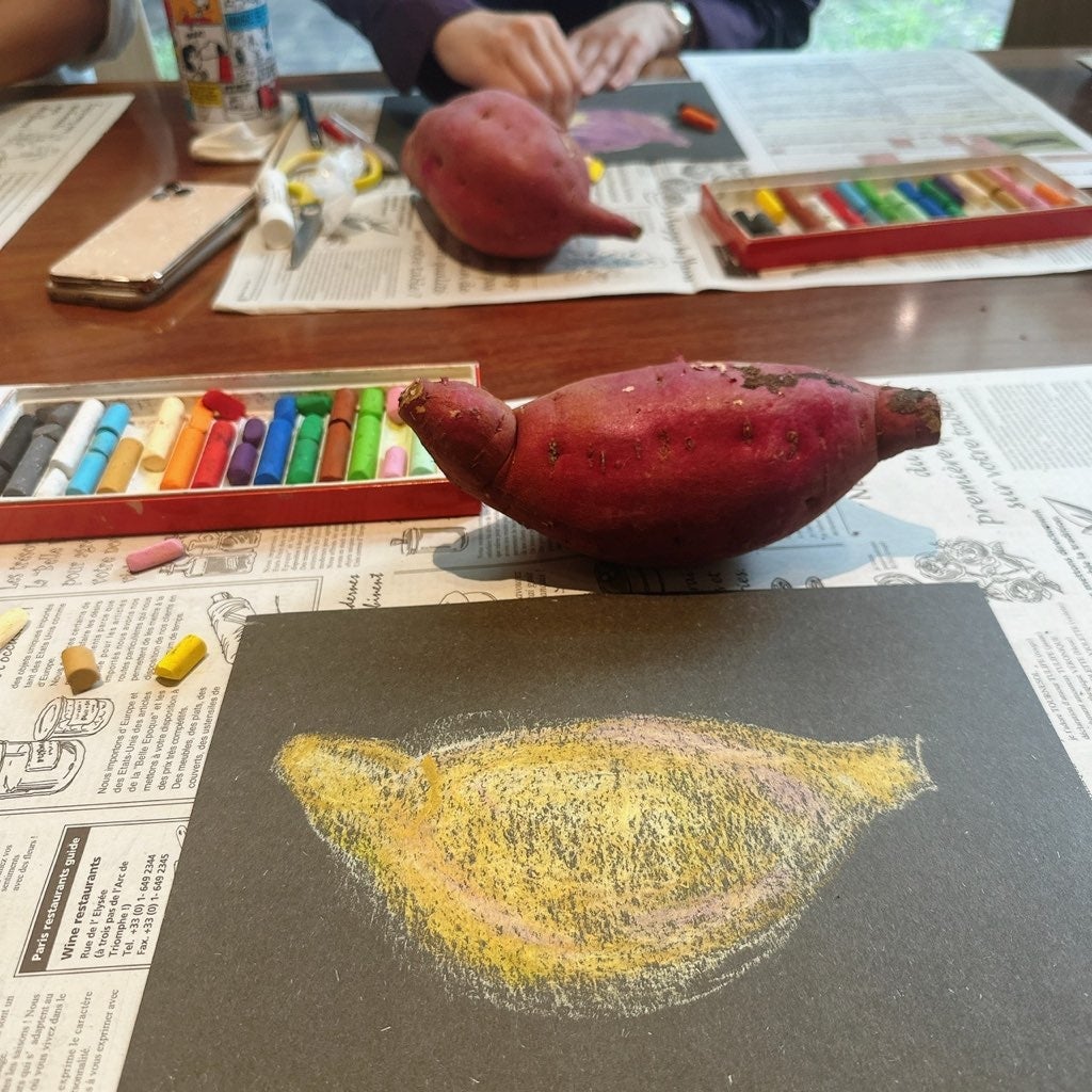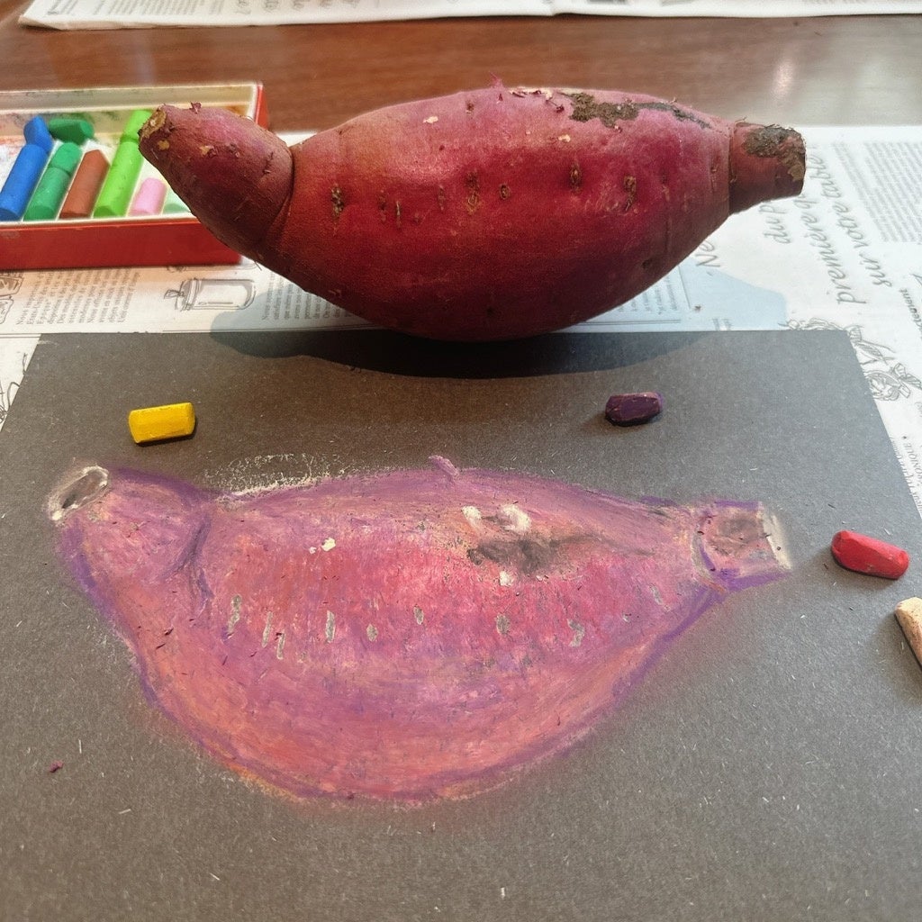 2023年11月のプログラムは「さつまいもの量感画」で、さつまいもを手に取って、じっくりと観察をしたら、その特有の形のおもしろさ・重さ・触り心地を感じたままに表現していきます。さつまいもの微妙な色の変化を発見し、オイルパステルで混色を楽しみながら描いてみましょう。