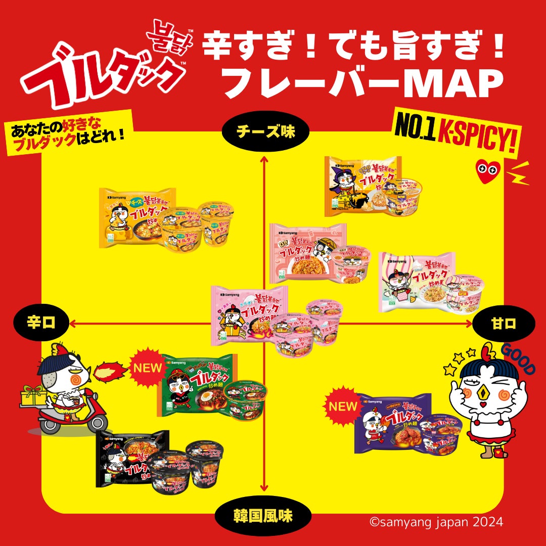 株式会社三養ジャパン(サムヤンジャパン)(本社:東京都、代表取締役:洪 範準)は、約100ヵ国で53億食の販売を突破した韓国発のK-SPICY代表ブランドである「ブルダック炒め麺」シリーズから、『ヤンニョムチキン味』『ジャジャン』の2種をそれぞれ袋麺とカップ麺の形態で11月より全国で順次発売いたします。