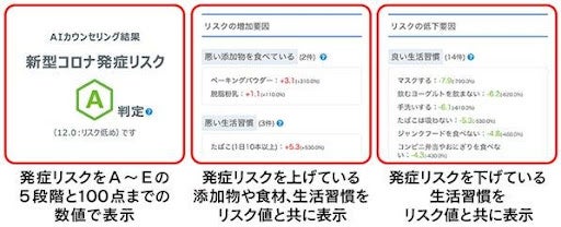 食品のバーコードや原材料名をAIが読み取り、生活習慣やこれまでになったことのある病気や症状を回答すると、AIが新型コロナを将来発症するリスクを5段階(A~E)で表示する、2021年12月にリリースされた世界初のスマホサービスです。いつも食べている食品の中で発症リスクの増加要因となる添加物や食材、生活習慣の中で何が悪いのか、既往症はどのように影響するのか、などが詳細にわかります。さらに、予防に役立つ生活習慣や、発症リスクが高い添加物や食材を含まない「Healthyフードリスト」も紹介します。
