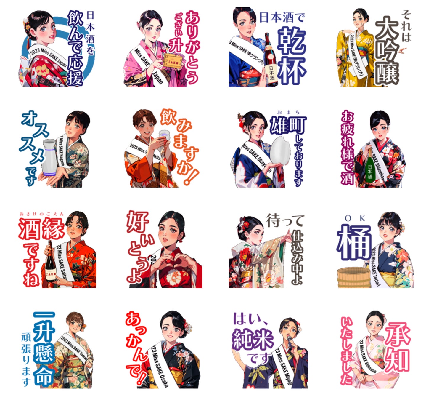 2023 Miss SAKE ファイナリストをメインに、可愛らしい日本のアニメや漫画をイメージさせるタッチのイラストにてスタンプを作成いたしました。