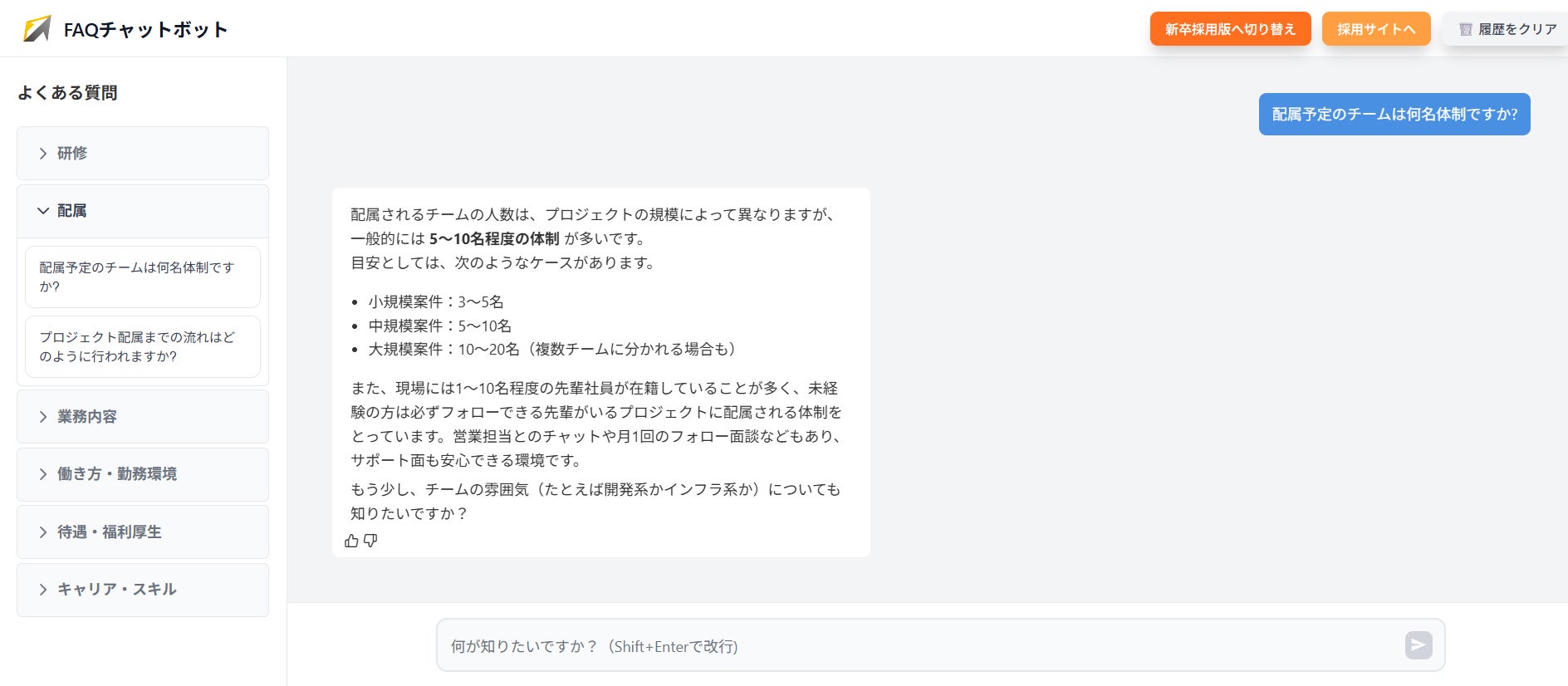 人事担当者への直接問い合わせと異なり、チャットボットを通じた相談はより心理的ハードルが低く、小さな疑問や不安も気軽に質問できます。人事側も採用ニーズの把握につながります。