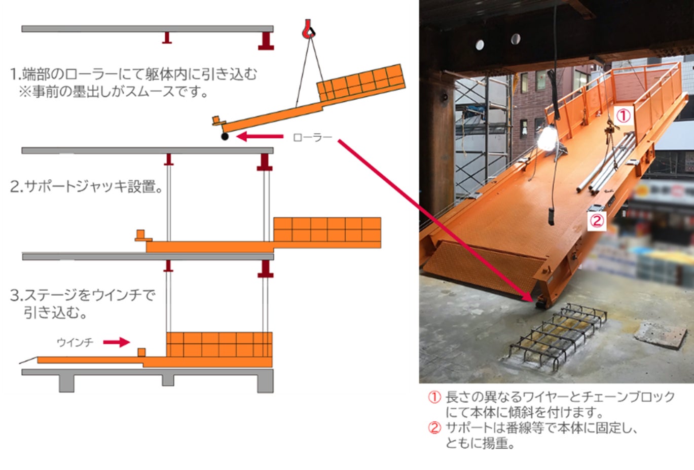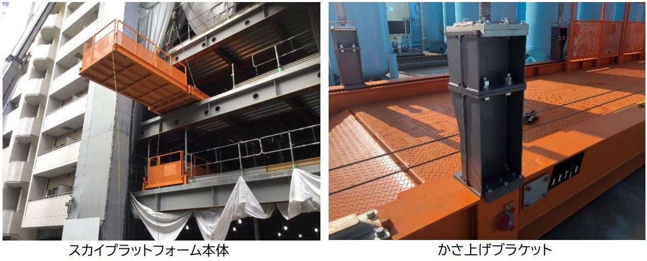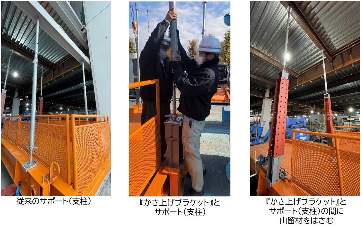今回、そのような問題を解決するため、新たにアクティオオリジナル『かさ上げブラケット』を開発し、従来の「スカイプラットフォーム」のサポート(支柱)では、届かなかった天井高にも対応できる商品として完成させました。アクティオオリジナル『かさ上げブラケット』を使用することで、安全、迅速に資機材の搬入が可能となり、工期の短縮を実現していきます。