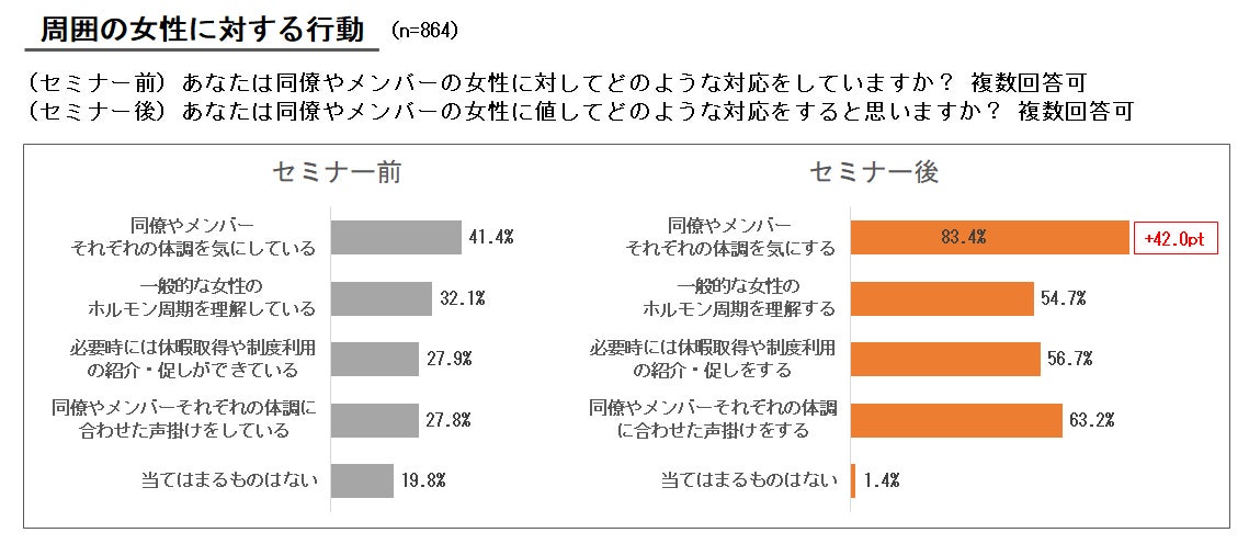 周囲の同僚やメンバーの女性に対して、「今後それぞれの体調変化を気にするだろう」と回答した人は8割以上となり、セミナー前から42.0pt 増加しました。