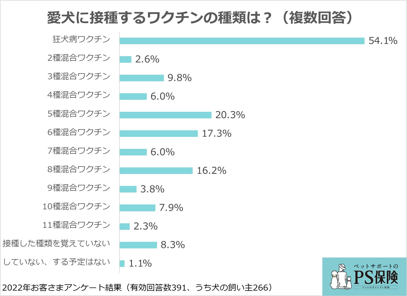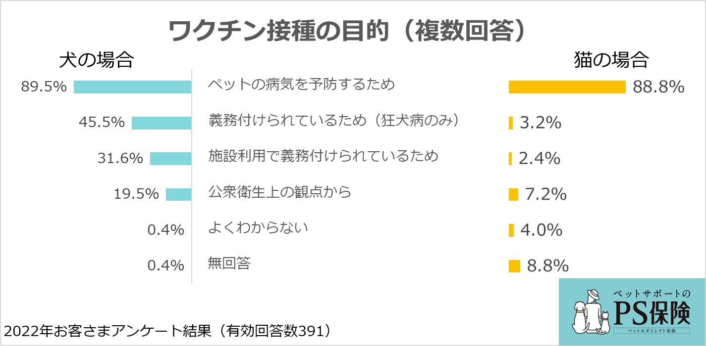 ペット保険の「PS保険」を提供する少額短期保険会社のペットメディカルサポート株式会社(本社:東京都港区赤坂、代表取締役社長:米満 明仁)は、当社ペット保険「PS保険」のご契約者さま2,682名(有効回答数391名)を対象に、愛犬と愛猫のワクチン接種に関するアンケート調査を行いました。