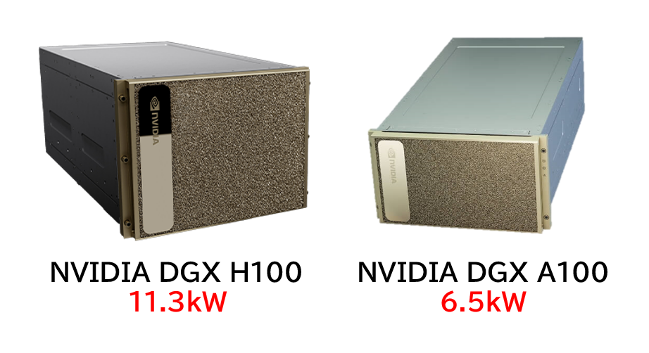 一般的なデータセンターのラック電力は2kVAしかありません。GPUサーバーの消費電力が1台2kVAとした場合、1ラックに1サーバーしか収容できず、ラックのスペースを無駄にしてしまいます。