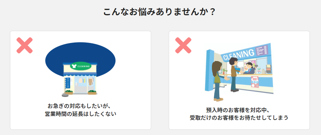 宅配ボックスをクリーニング店に設置することで、ボックスを通じて24時間いつでも、仕上がり品を無人でお渡し出来るようになります。お客様の利便性が向上し、収益力アップにつながるだけでなく、店舗の人件費の削減も実現します。