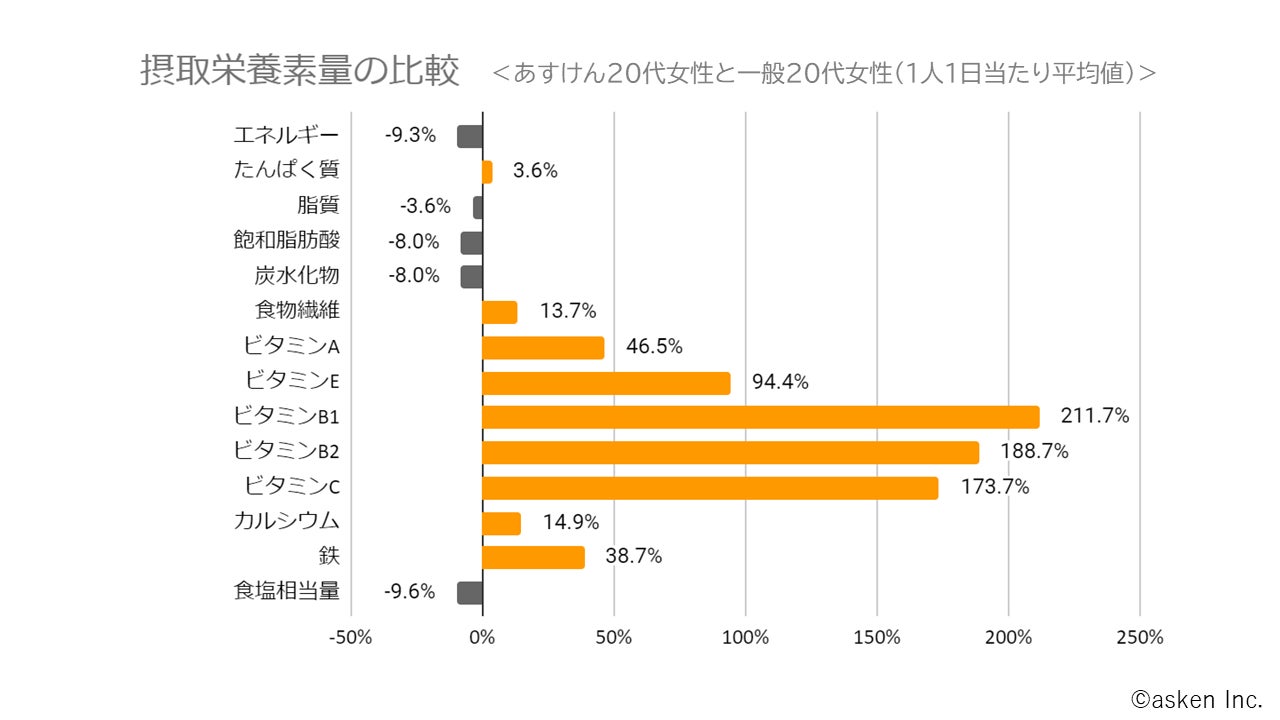 国内No.1*¹AI食事管理アプリ『あすけん』を運営する株式会社asken(東京都新宿区、代表取締役社長 中島洋、以下「当社」)は、この度『あすけん』を継続利用する20代女性の食事記録から、栄養素の摂取状況を集計した結果、脂質や食塩相当量の平均摂取量は少なく、たんぱく質、食物繊維、ビタミン・ミネラル類の摂取量は一般20代女性の栄養摂取状況*²(以下、一般20代女性)よりも多いことがわかりました。『あすけん』の継続利用が栄養バランスの良い食生活の実践につながることが伺える結果となりました。
